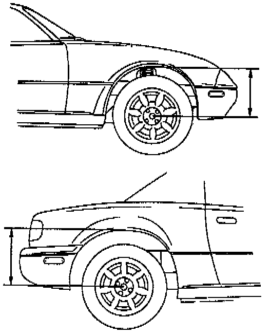 6. Measure the height from the center of the wheel to the fender brim. The difference between left and right measurement must not exceed 10 mm (0.39 inch), and the rear measurement must be larger then the front measurement by 10 - 30 mm (0.4 - 1.1 inch).