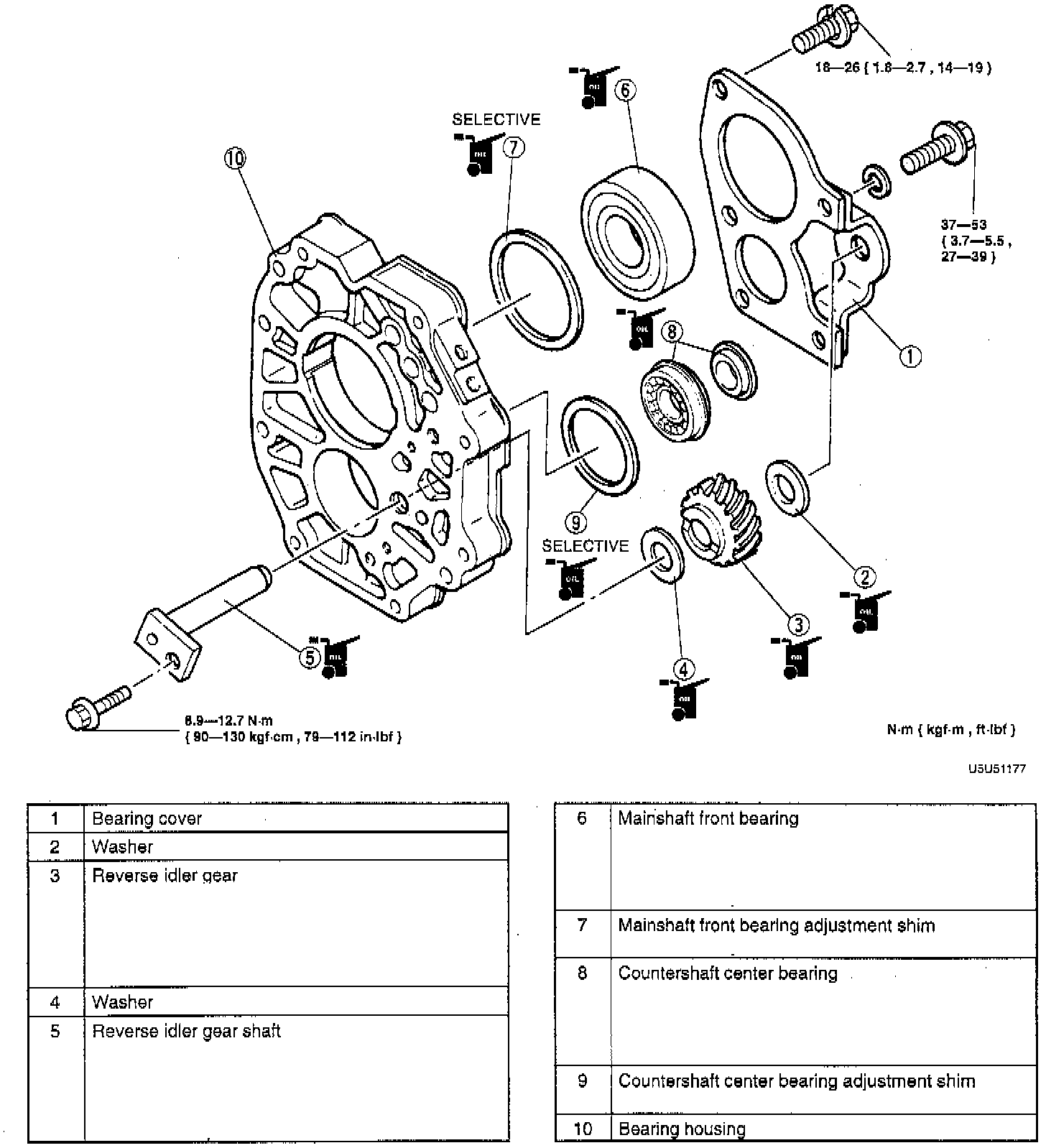 4. Measure the clearance between the mainshaft front bearing and the bearing housing. If not within 0 - 0.1 mm (0 - 0.004 inch), adjust the clearance by installing the correct adjustment shim(s). Adjustment shim sizes 0.1 mm (0.004 inch), 0.15 mm (0.006 inch), 0.3 mm (0.012 inch).