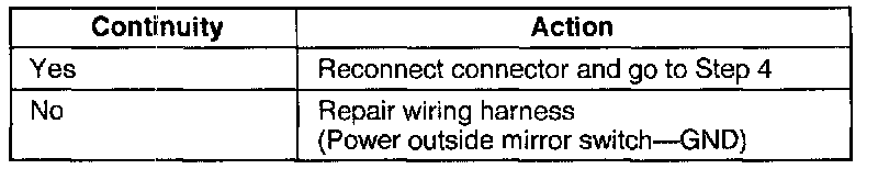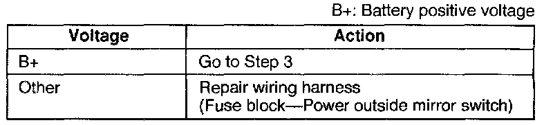 4. If not as specified, repair the wiring harness (power outside mirror switch-outside mirror).