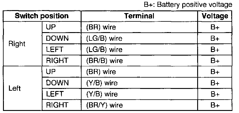 2. Measure the voltage at the terminal wires of the power outside mirror switch connector with the power outside mirror switch in the following positions.