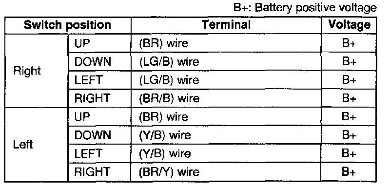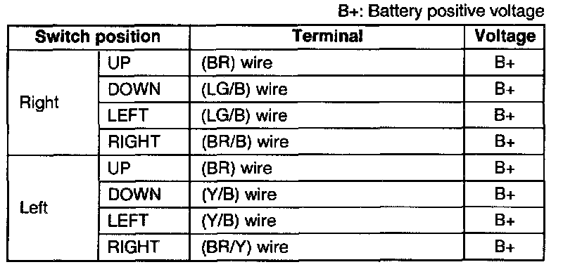 3. Measure the voltage at the terminal wires of the power outside mirror switch connector with the power outside mirror switch in the following positions.