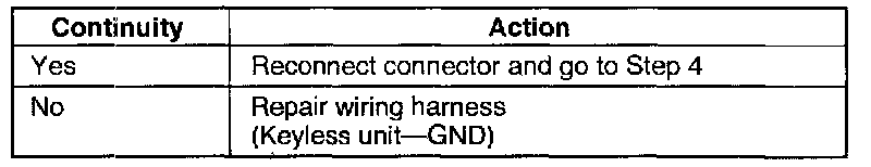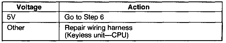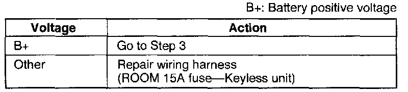 Measure the voltage at terminal E (R/Y) wires of the keyless unit connectors.