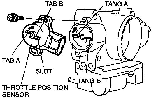 5. Open the throttle valve slightly and catch the tang of the throttle body on the throttle position sensor plastic tabs. Adjust tang A on throttle body with tab A on throttle position sensor. Note tangs on the throttle body mate with the tabs on the throttle position sensor on the side of the tab without a slot.