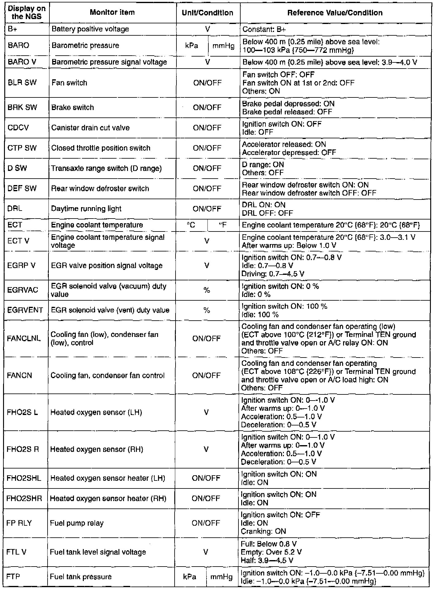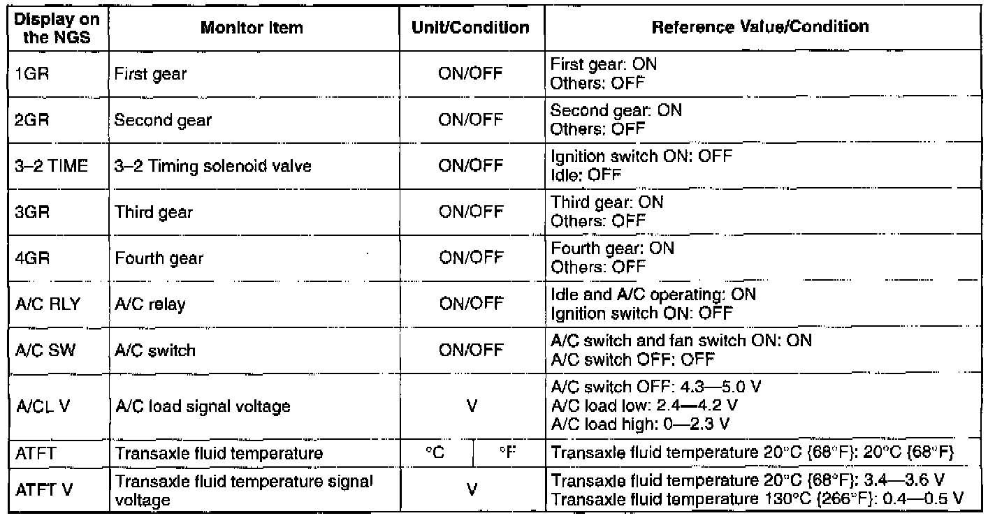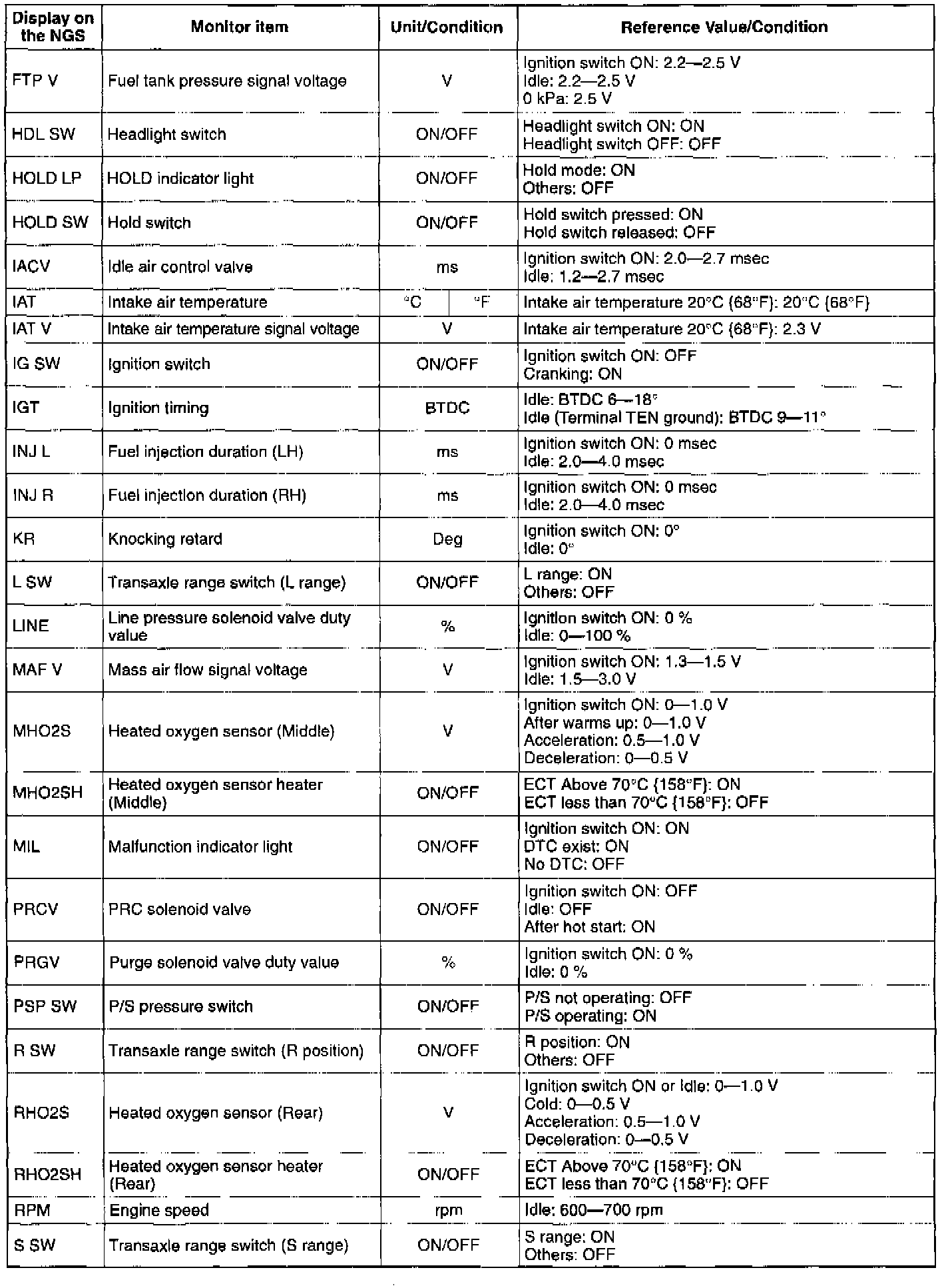 NOTE: The "PID/DATA MONITOR AND RECORD" function is to monitor the calculation value of input/output signals in the PCM. Deviation in the value does not always indicate malfunction in the related input/output devices (sensors and solenoids).