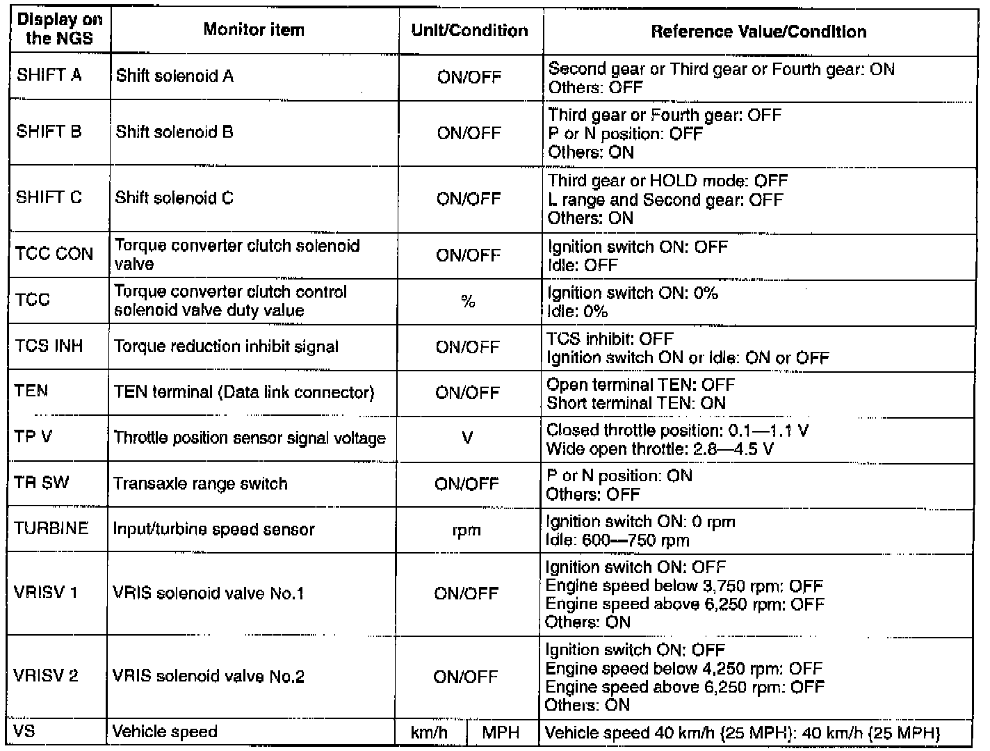 PID/DATA MONITOR TABLE