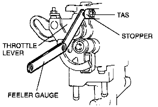 5. Insert a 0.50 mm (0.020 in) feeler gauge between the throttle adjusting screw (TAS) and the throttle lever. Verify that there is no continuity.