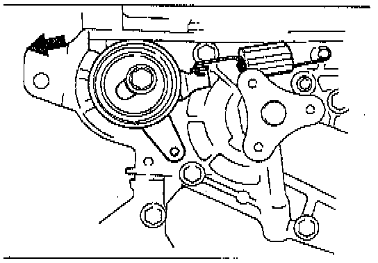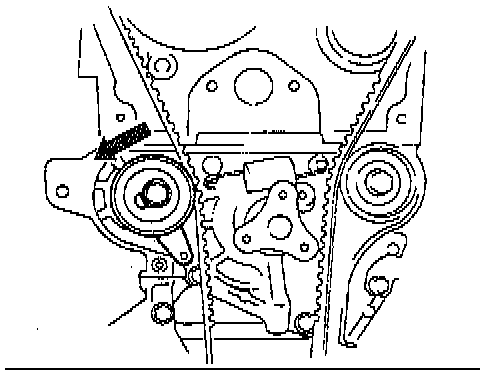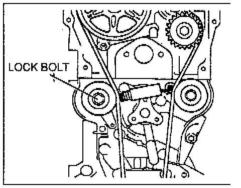 2. Loosen the tensioner lock bolt to apply tension to the timing belt. Do not apply tension other than that of the tensioner spring.