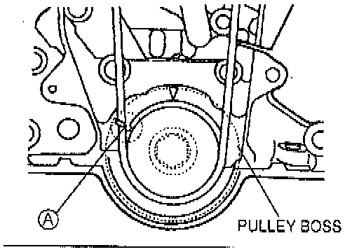 1. Install the pulley boss and pulley lock bolt. Turn the crankshaft clockwise 1 and 5/6 times, and verify that the timing mark and the tensioner set mark (A) are aligned.
