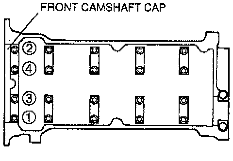 1. Loosen the front camshaft cap bolts in five or six steps in the order shown.