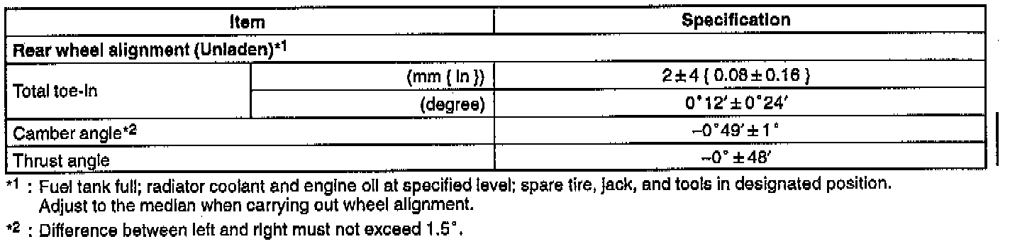 NOTE: In order to maintain the specified thrust angle of 0° +/-0.80°, the rear toe-in setting must be adjusted. If the thrust angle cannot be adjusted to that specification, check the body dimensions.