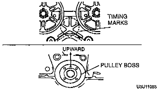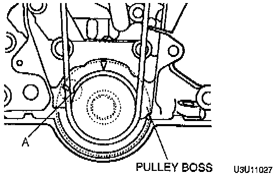 3. Install the pulley boss and pulley lock bolt. Turn the crankshaft clockwise 1 and 5/6 times, and verify that the timing mark on the timing belt pulley is aligned with timing mark A (tensioner set mark).