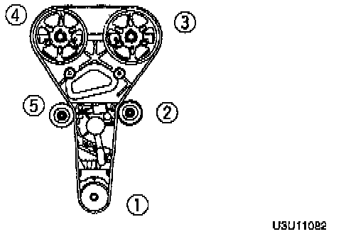 2. Install the timing belt on the pulleys in the order shown.