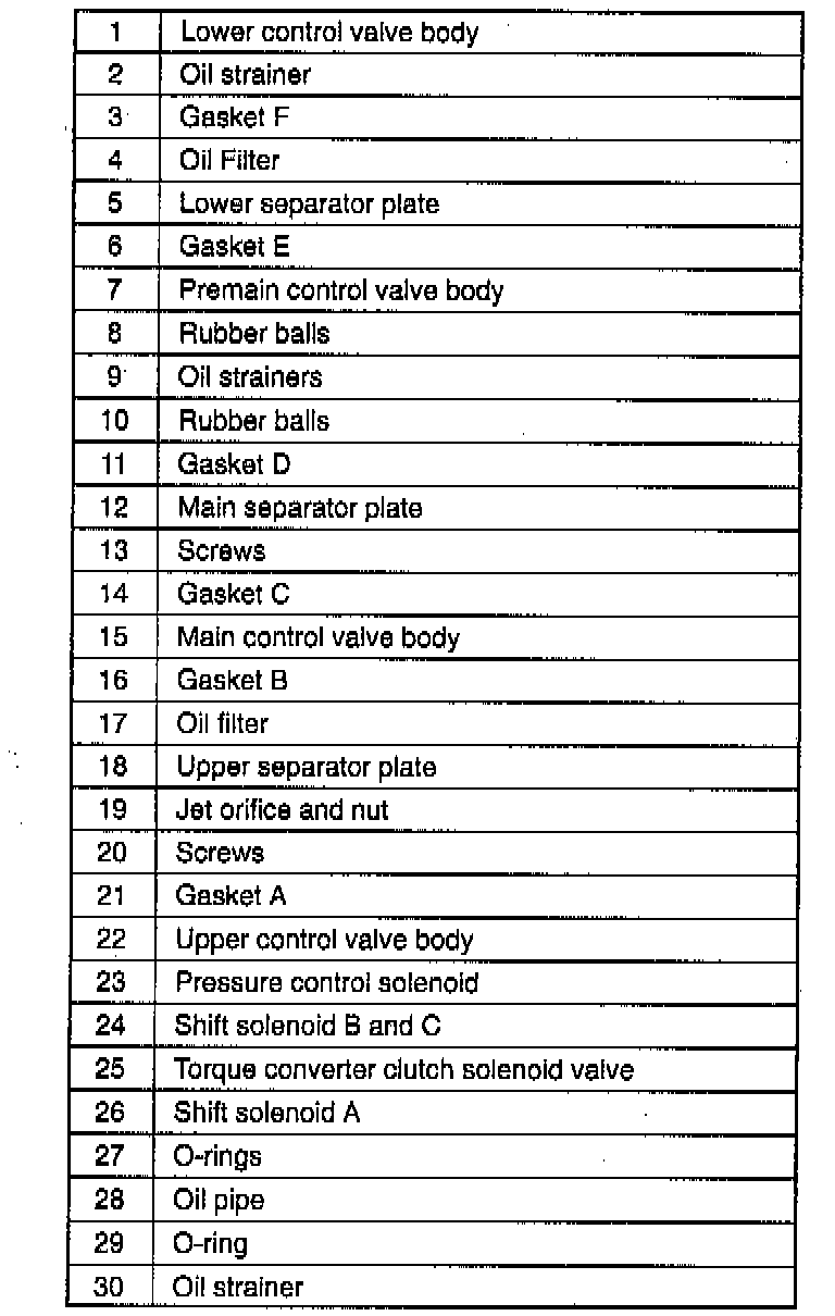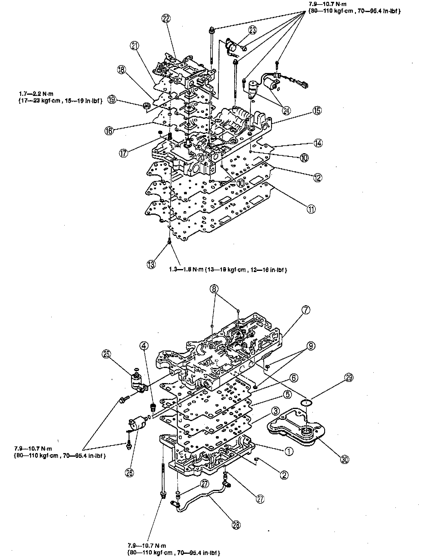 19. Tighten the Upper, main, and lower control valve body to 7.9 - 10.7 Nm (70 - 95.4 inch lbs.).