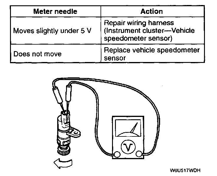 2. Measure the voltage between terminals of the vehicle speedometer sensor while rotating the driven gear.