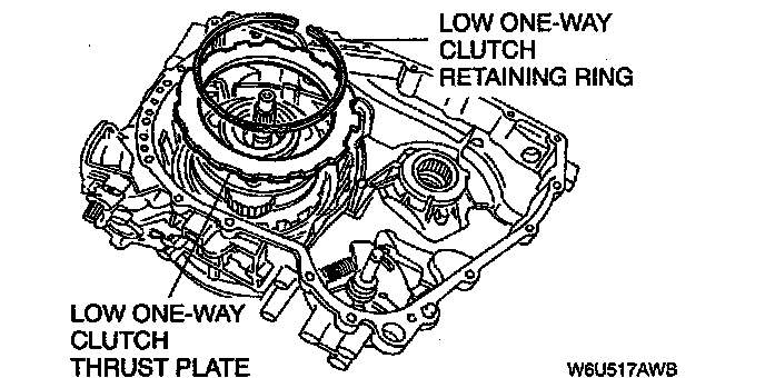 59. Install the low one-way clutch retaining ring. Position the retaining ring ends in an area near the case lugs.