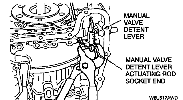 61. Snap the opposite socket end of the manual valve detent lever actuating rod on the manual valve detent lever.