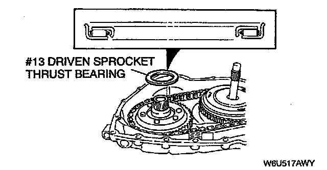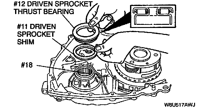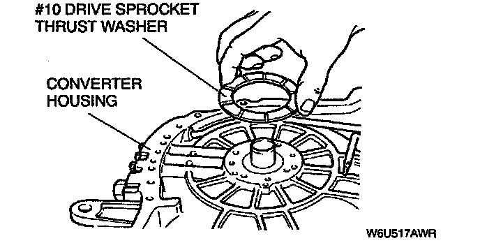 81. Remove the gauge bar and preload tool. Apply petroleum jelly to the selected # 10 drive sprocket thrust washer and install on the converter housing. Remove the drive sprocket.