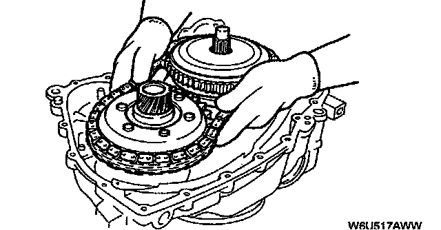 86. Lower the chain drive and its sprockets together in the transaxle case. Verify that both sprockets are seated.