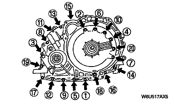 101. Install the twenty converter housing-to-transaxle case bolts or replace bolts. Tighten the bolts in the sequence shown.