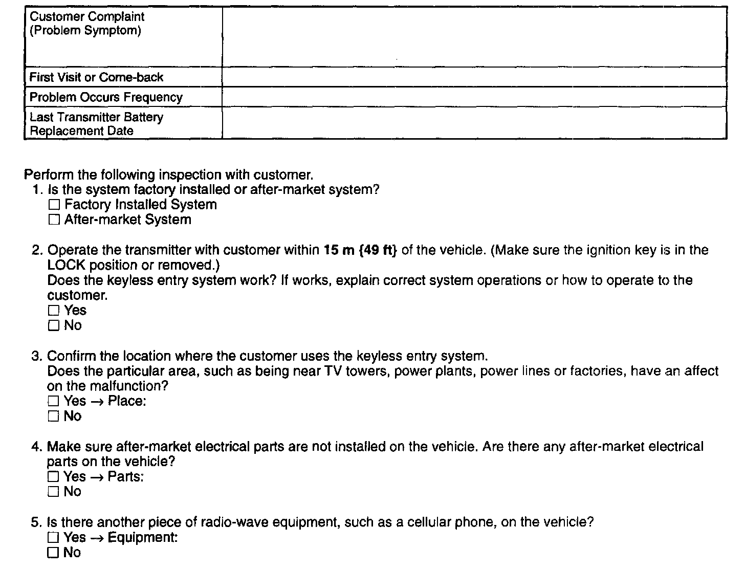 Keyless Entry System Problem Check Sheet