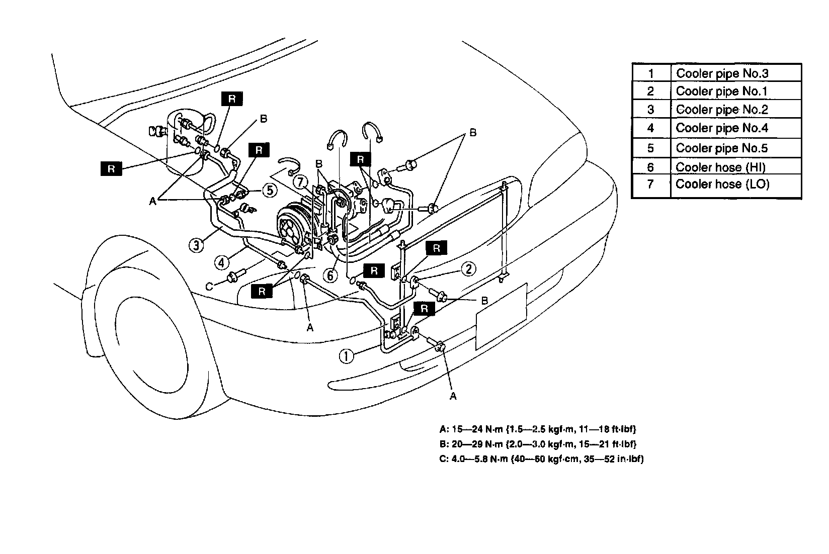 7. Remove the accumulator tank, then remove cooler pipe No.5.