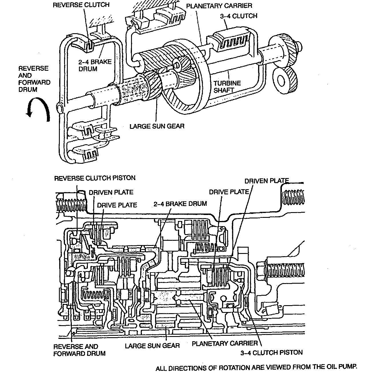 - When hydraulic pressure acts on the clutch piston, the drive plates and the driven plates are pressed tightly together, and the rotation of the turbine shaft is transmitted, via the reverse and forward drum and the 2-4 brake drum, to the large sun gear. A diaphragm spring is used for return spring.