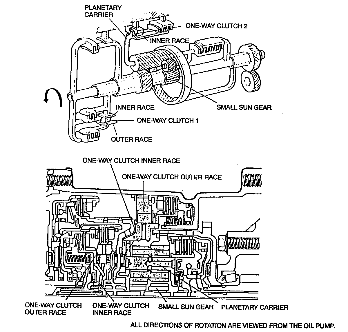 - If the rotation speed of the one-way clutch outer race is faster than that of the one-way clutch inner race, the sprags enter between the two races and lock them. Consequently, the driving force is transferred to the small sun gear via one-way clutch 1. During in 4GR, one-way clutch 1 runs idle and does not transfer the driving force because the rotation speed of the one-way clutch inner race is faster.