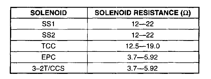 Solenoids Electronic Pressure Control (EPC), Shift Solenoid No.1 (SS1), Shift Solenoid No.2 (SS2), Torque Converter Clutch (TCC), 3-2 Timing/coasting clutch solenoid (3-2T/CCS)