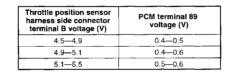 (8) When the throttle valve is at the wide open throttle, verify that the PCM terminal 89 voltage is in the specification.