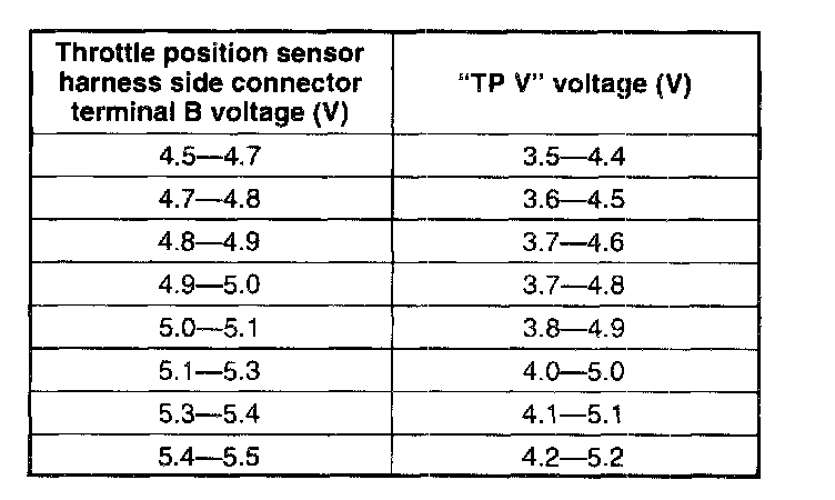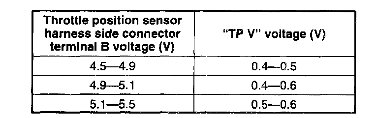 (7) When the throttle valve is at the wide open throttle, verify that the "TP V" voltage is in the specification.