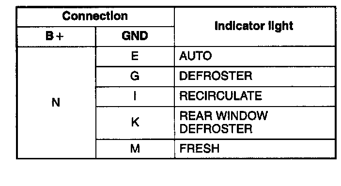 4. Apply battery positive voltage to terminal N and ground to terminal E, G, I, K, M and verify that the following indicators turn on.