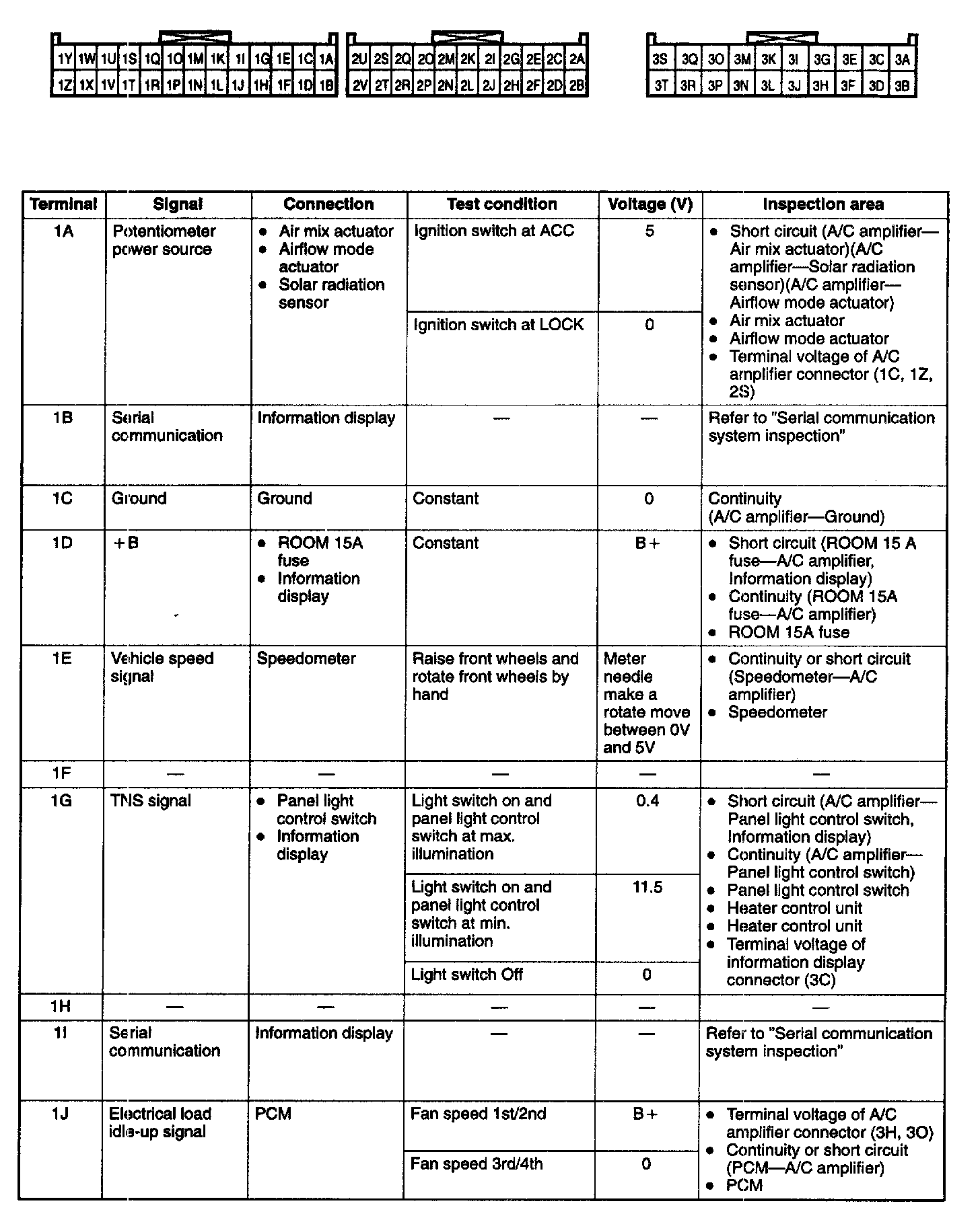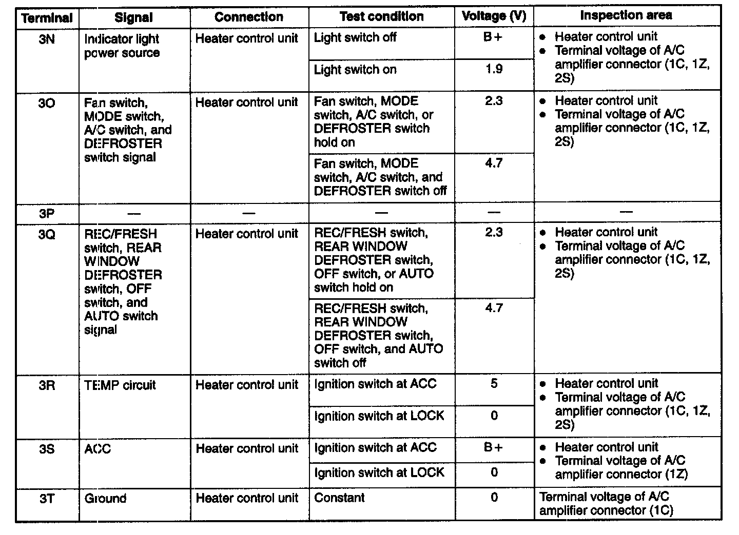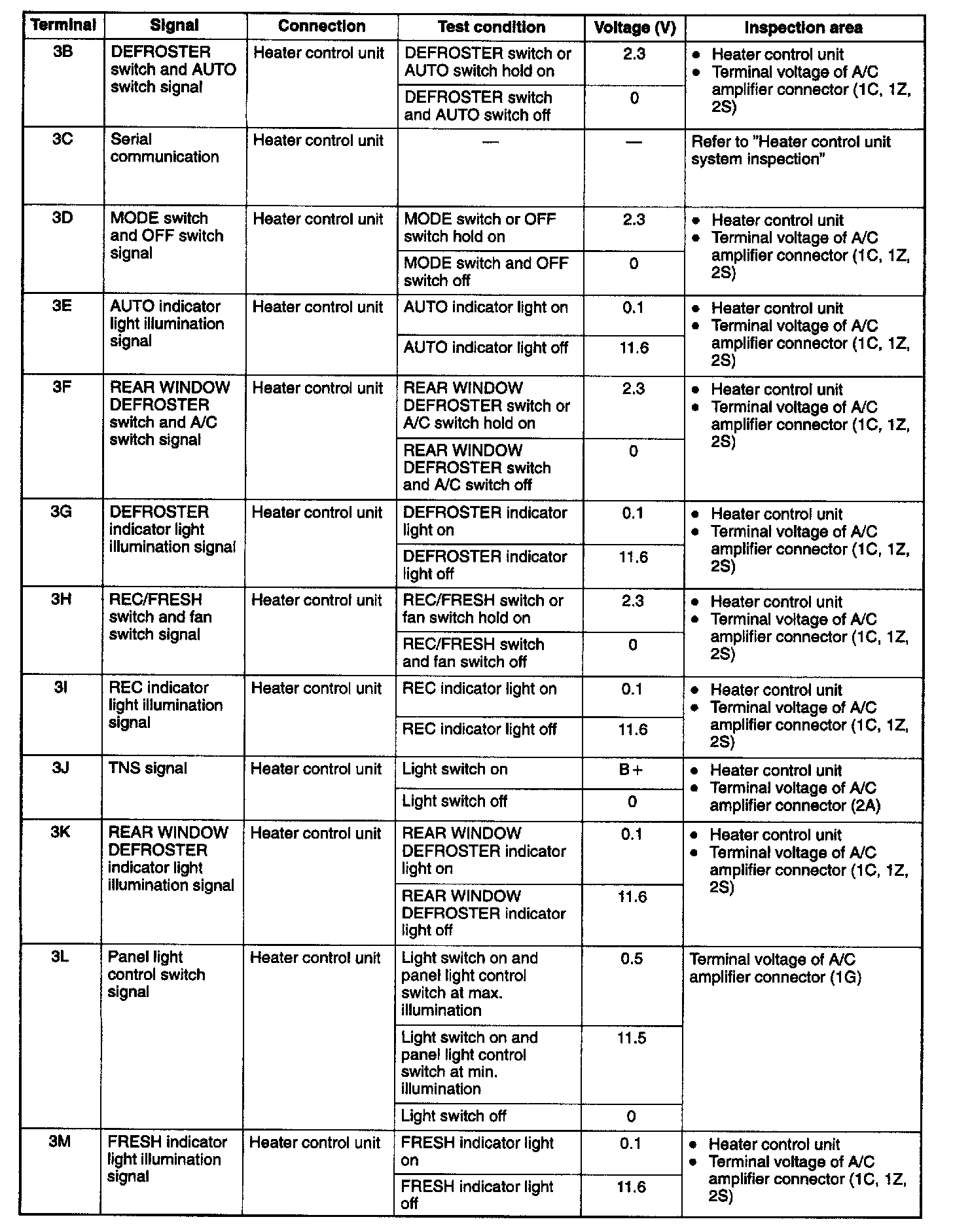 4. Measure the voltage at each A/C amplifier terminal and refer to the terminal voltage list.