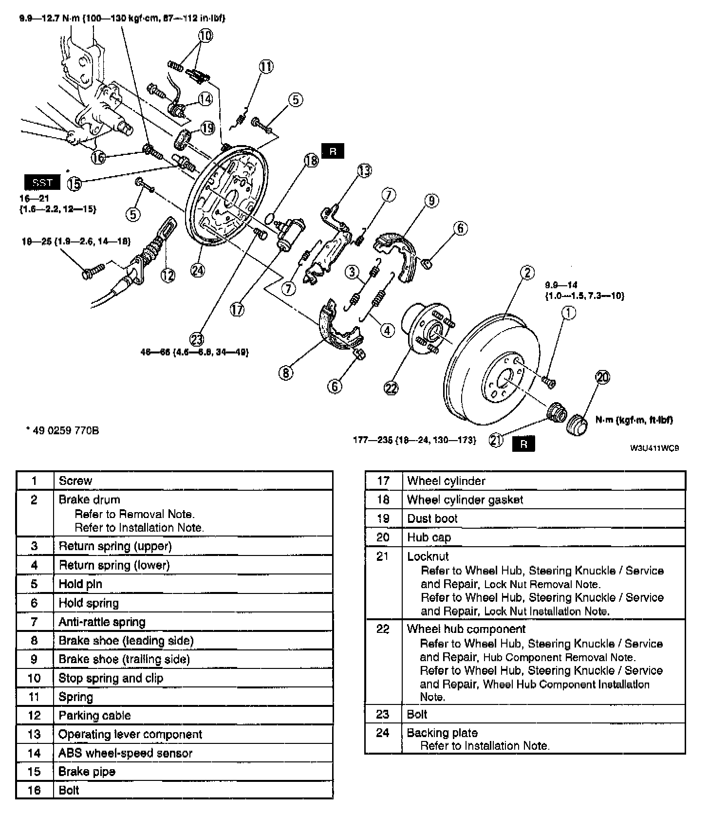 - If the brake drum is hard to remove, loosen the parking cable nut fully and secure the stopper until the operating lever returns to release the sticking of the brake drum.