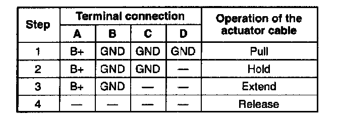 3. Connect the battery positive voltage and a ground to the terminals as shown and confirm the operation of the actuator cable.
