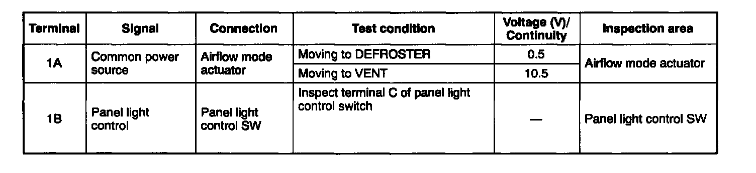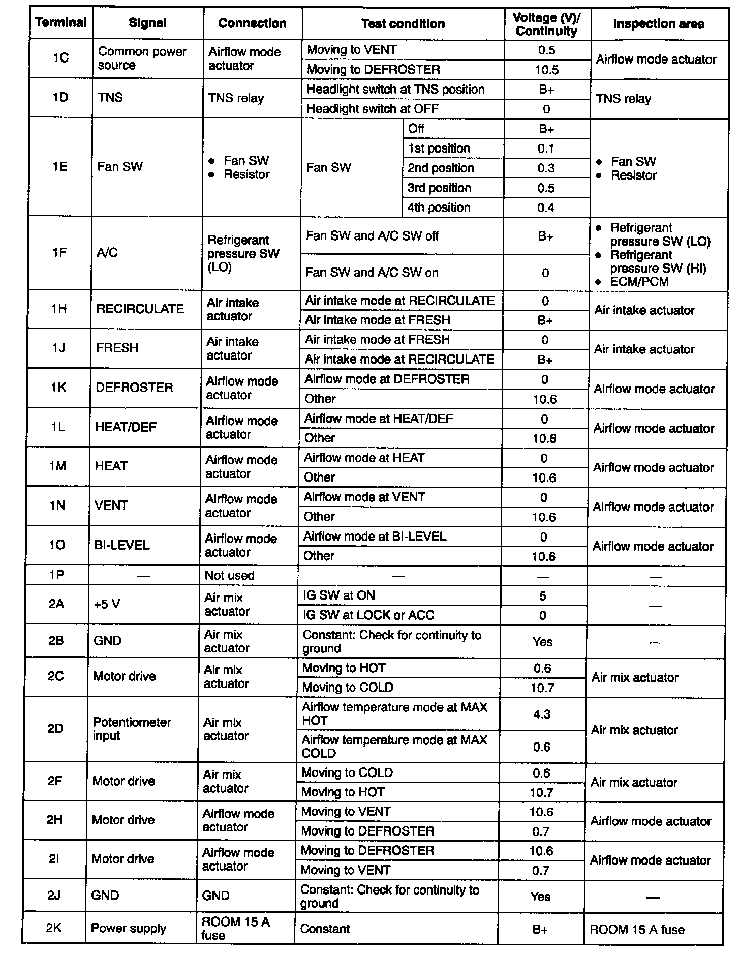 2. Measure the voltage at each climate control unit terminal and refer to the terminal voltage list.