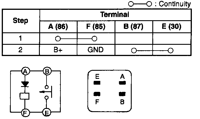 1. Remove the main relay.2. Apply battery positive voltage and check continuity between terminals of the main relay by using an ohmmeter.