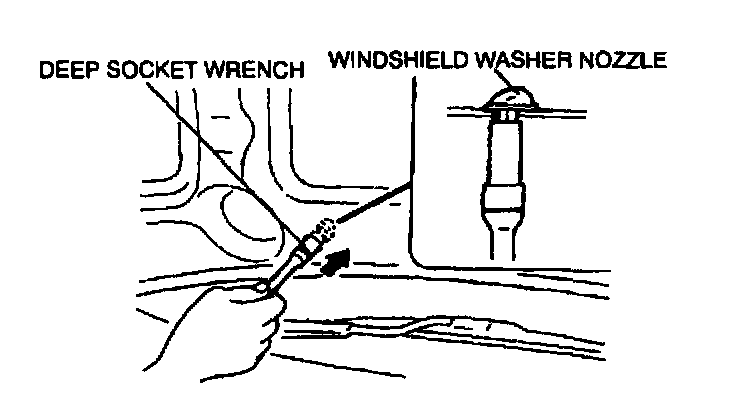 3. Remove the windshield washer nozzle by using a 10 mm (0.4 in) deep socket wrench from underneath the bonnet.