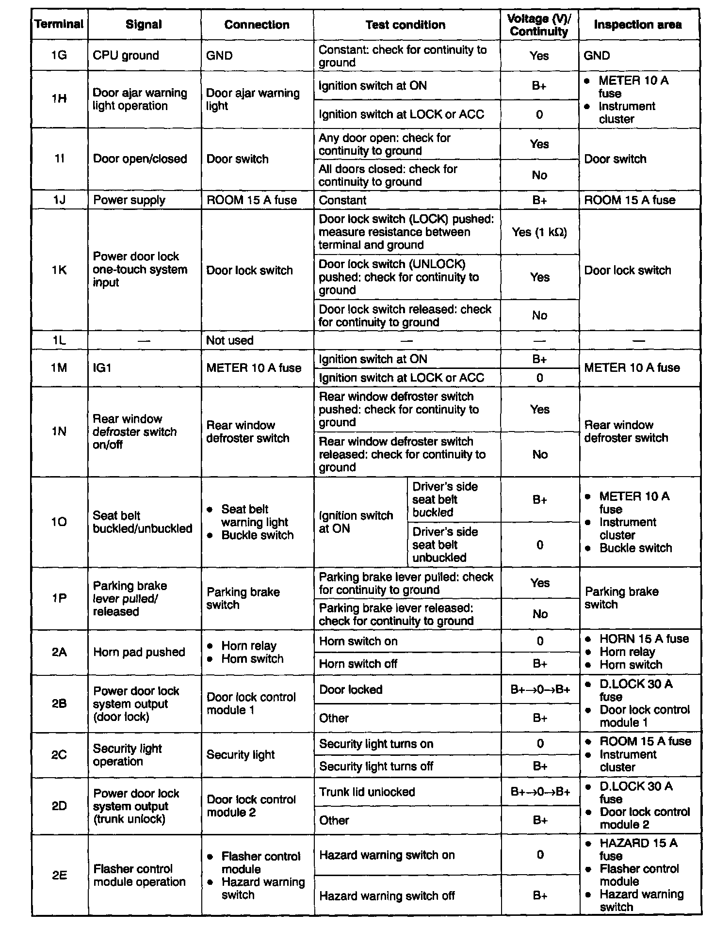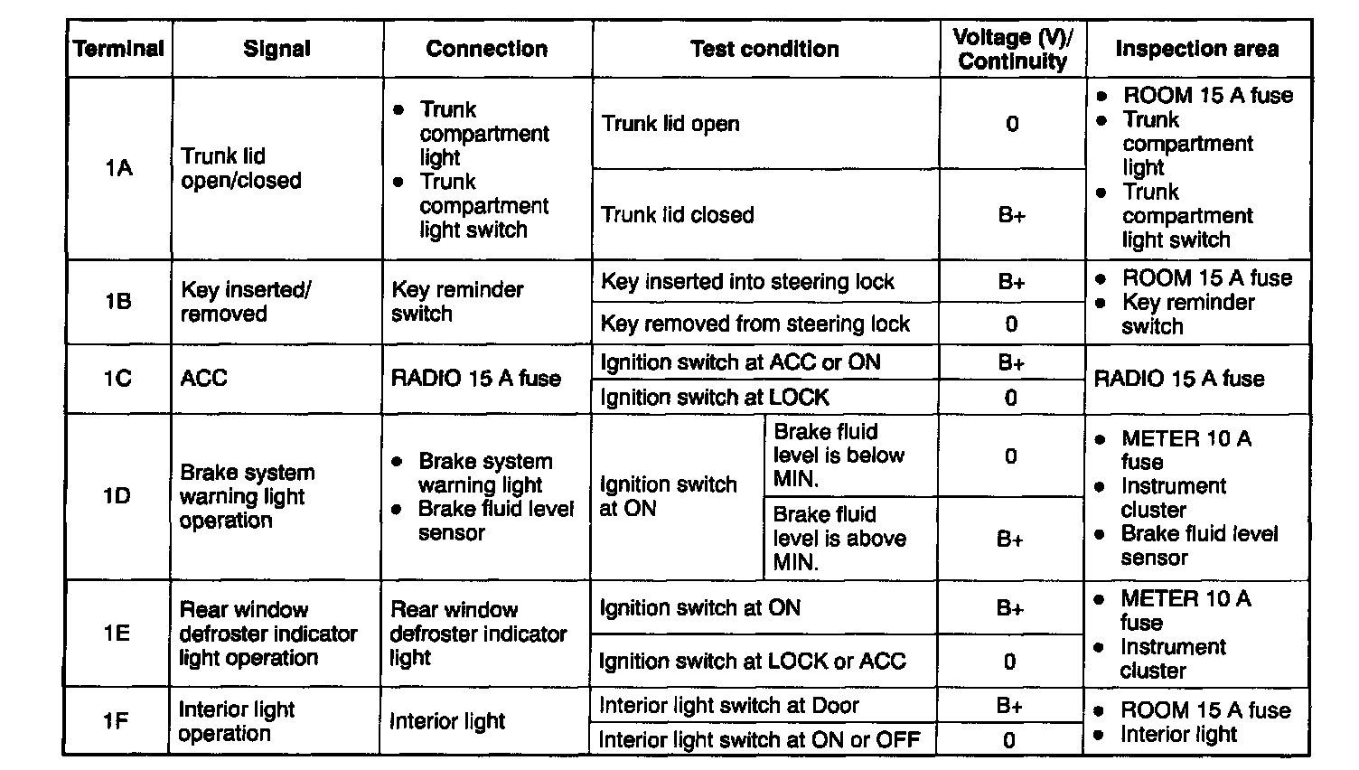 5. If not as specified, inspect' the parts listed under Inspection area" and the related wiring harnesses.