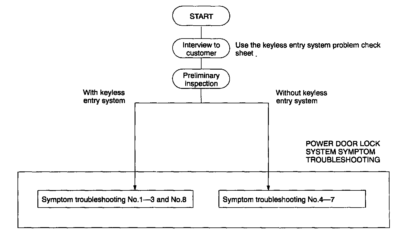 - For malfunction in power door lock system with keyless entry system, perform preliminary inspection at first, then perform troubleshooting No.1-3 and No.8.