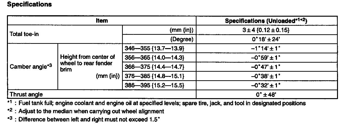 - Turning the front cam one graduation changes the camber about 13' and the toe-in about 2.3 mm (0.11 inch). Turning the rear cam one graduation changes the camber about 8' and the toe-in about 2.3 mm (0.11 inch).