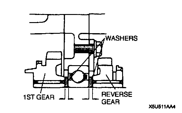 5. Verify that the centers of the shift fork and clutch hub sleeve are aligned properly. If they are not, select the proper washer to install between 1st gear and the mainshaft front bearing, and between reverse gear and the mainshaft front bearing.