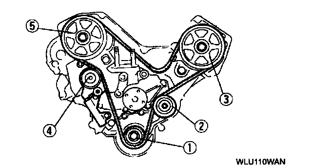 3. With the No.1 idler pulley removed, install the timing belt on the pulleys in the order shown below.