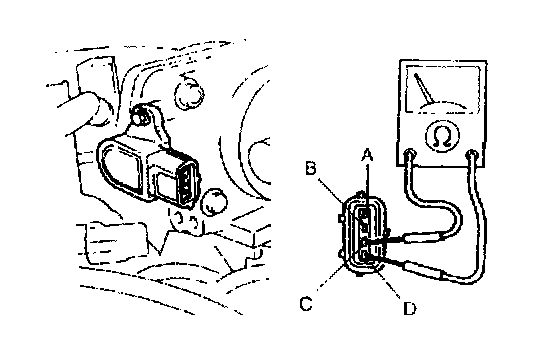 4. Insert a feeler gauge between the throttle adjusting screw (TAS) and the throttle lever. By adjusting the throttle adjusting screw (TAS), verify the continuity between the closed throttle position switch terminals C and D are as follows by using an ohmmeter.