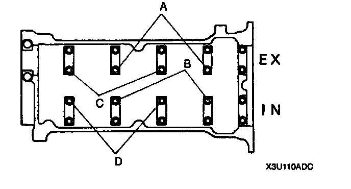 - For IN side No.2, 3 cylinder adjustment shim removal, remove bolts either B or D.