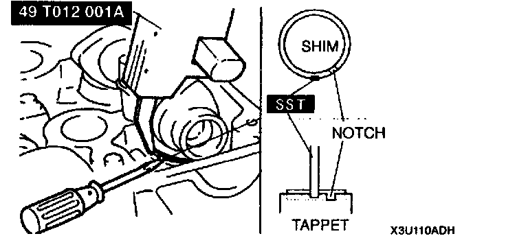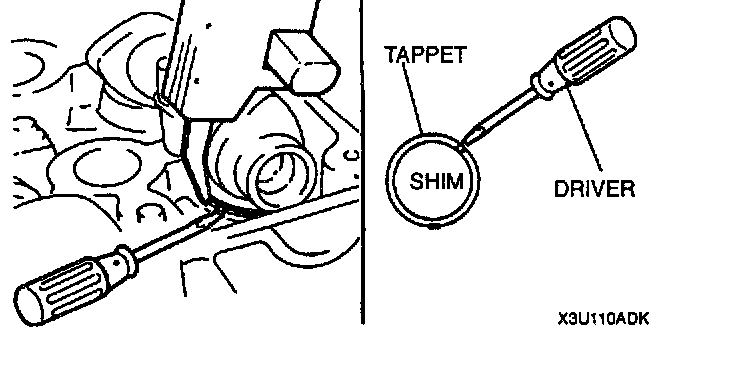 11. Using a fine screwdriver, pry up the adjustment shim through the notch on the tappet. Remove the shim using a magnet.