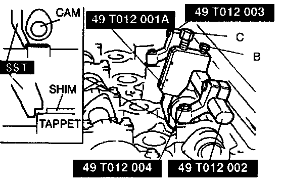 B: For IN side No.1, 2, 3 cylinder adjustment shim removal.