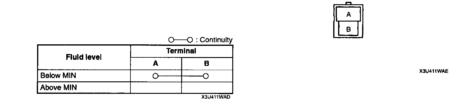 4. Remove the brake fluid and verify that there is continuity when the level is below MIN. If not as specified, replace the sensor.