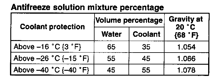7. Referring to the following chart, select proper volume percentage of the water and coolant.