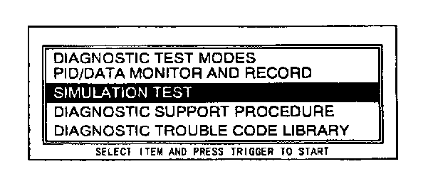 1. Perform steps 1 through 8 from the DTCs Reading Procedure.2. Turn ignition switch on. Move the cursor to SIMULATION TEST. Press the trigger key to enter this selection.
