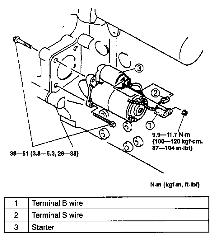 STARTER REMOVAL/INSTALLATIONWARNING: When the battery cables are connected, touching the vehicle body with starter terminal B will generate sparks. This can cause personal injury, fire, and damage to the electrical components. Always disconnect the battery before performing the following operation.